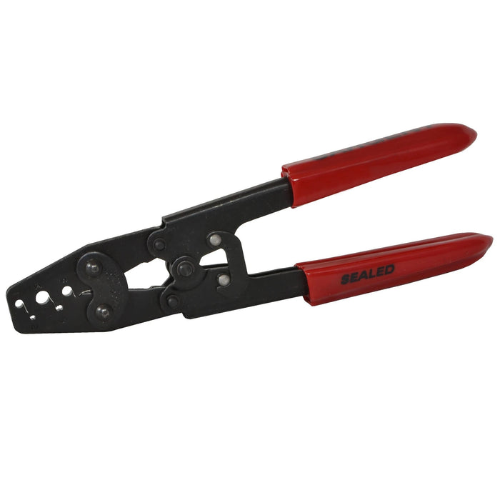 Generic ratcheted hand crimp tool for terminals utilizing single wire seals and is ideal for quick field repairs and prototyping. These crimpers will crimp the following size automotive terminals: 0.64 mm, 1.0 mm, 1.2 mm, 1.5 mm, 1.8 mm, 2.3 mm, 4.8 mm, and 6.3 mm.
